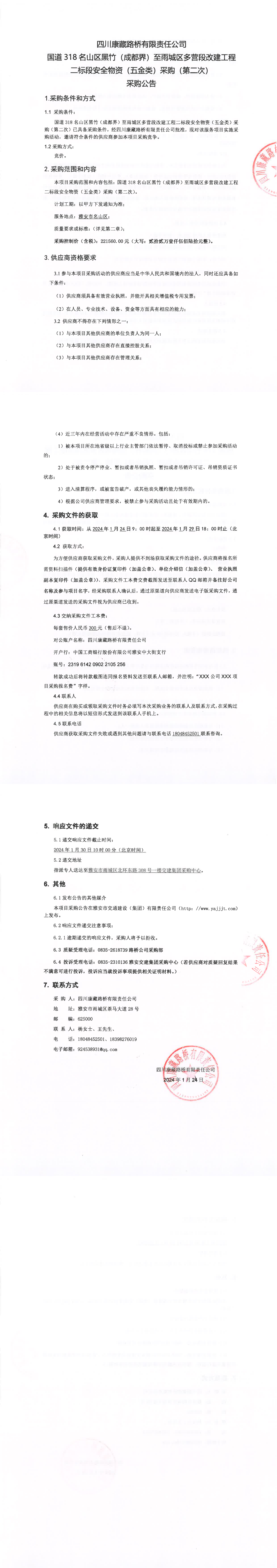 四川康藏路橋有限責(zé)任公司國道318名山區(qū)黑竹(成都界)至雨城區(qū)多營段改建工程二標段安全物資(五金類)采購(第二次)采購公告