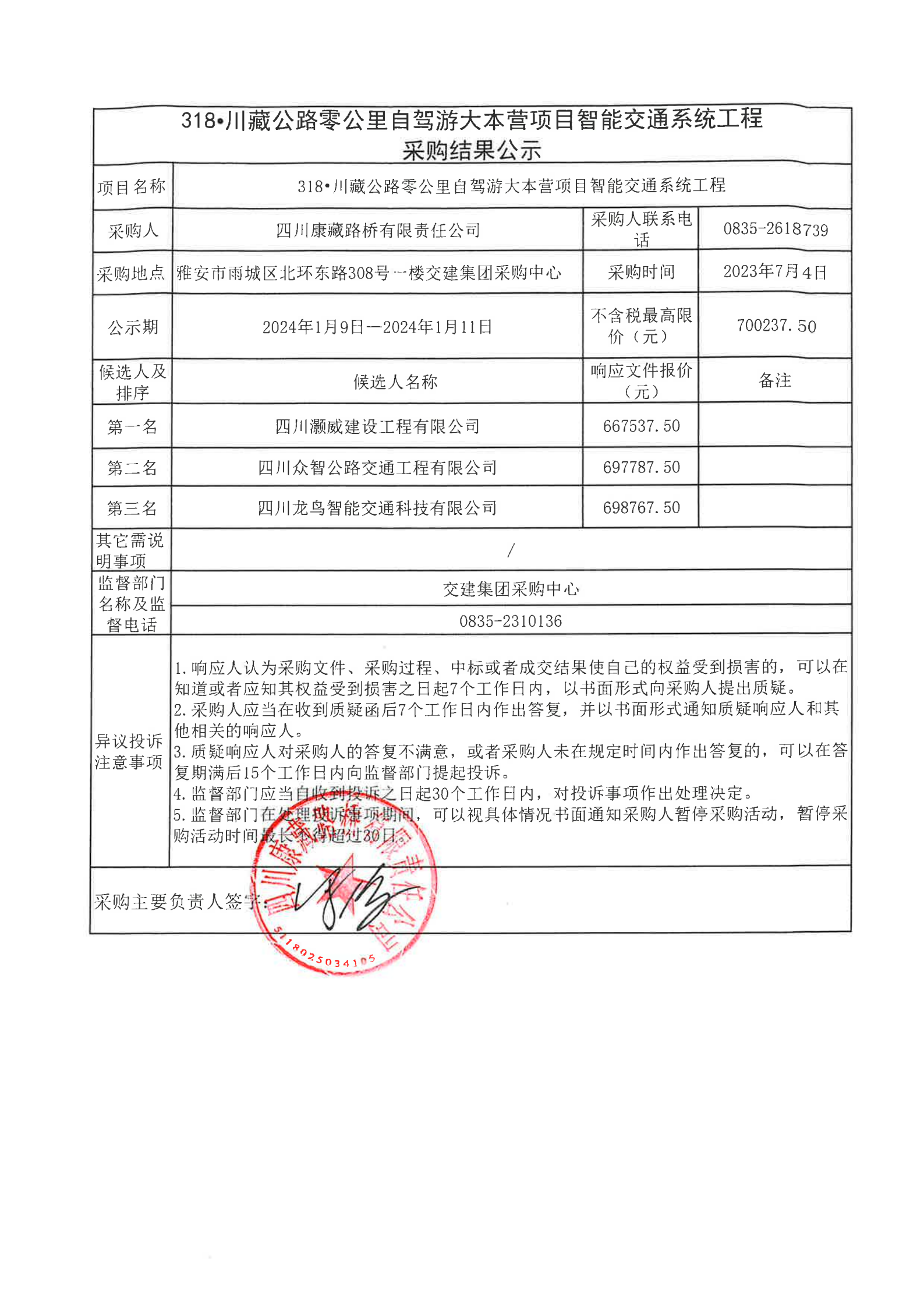 四川康藏路橋有限責任公司318·川藏公路零公里自駕游大本營項目智能交通系統(tǒng)工程采購結果公示
