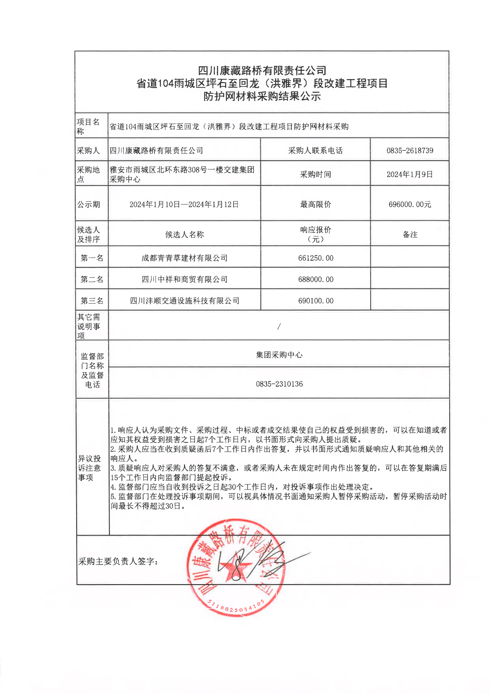 四川康藏路橋有限責(zé)任公司省道104雨城區(qū)坪石至回龍(洪雅界)段改建工程項目防護(hù)網(wǎng)材料采購結(jié)果公示