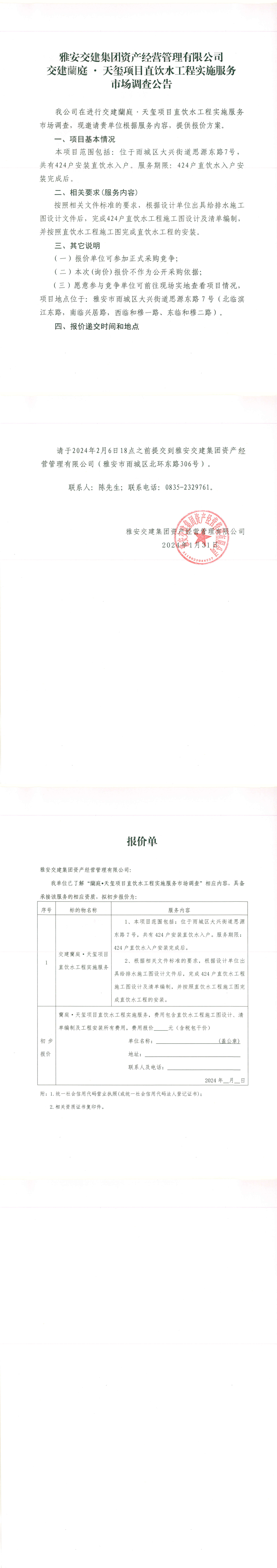雅安交建集團(tuán)資產(chǎn)經(jīng)營管理有限公司交建蘭庭·天璽項(xiàng)目直飲水工程實(shí)施服務(wù)市場(chǎng)調(diào)查公告