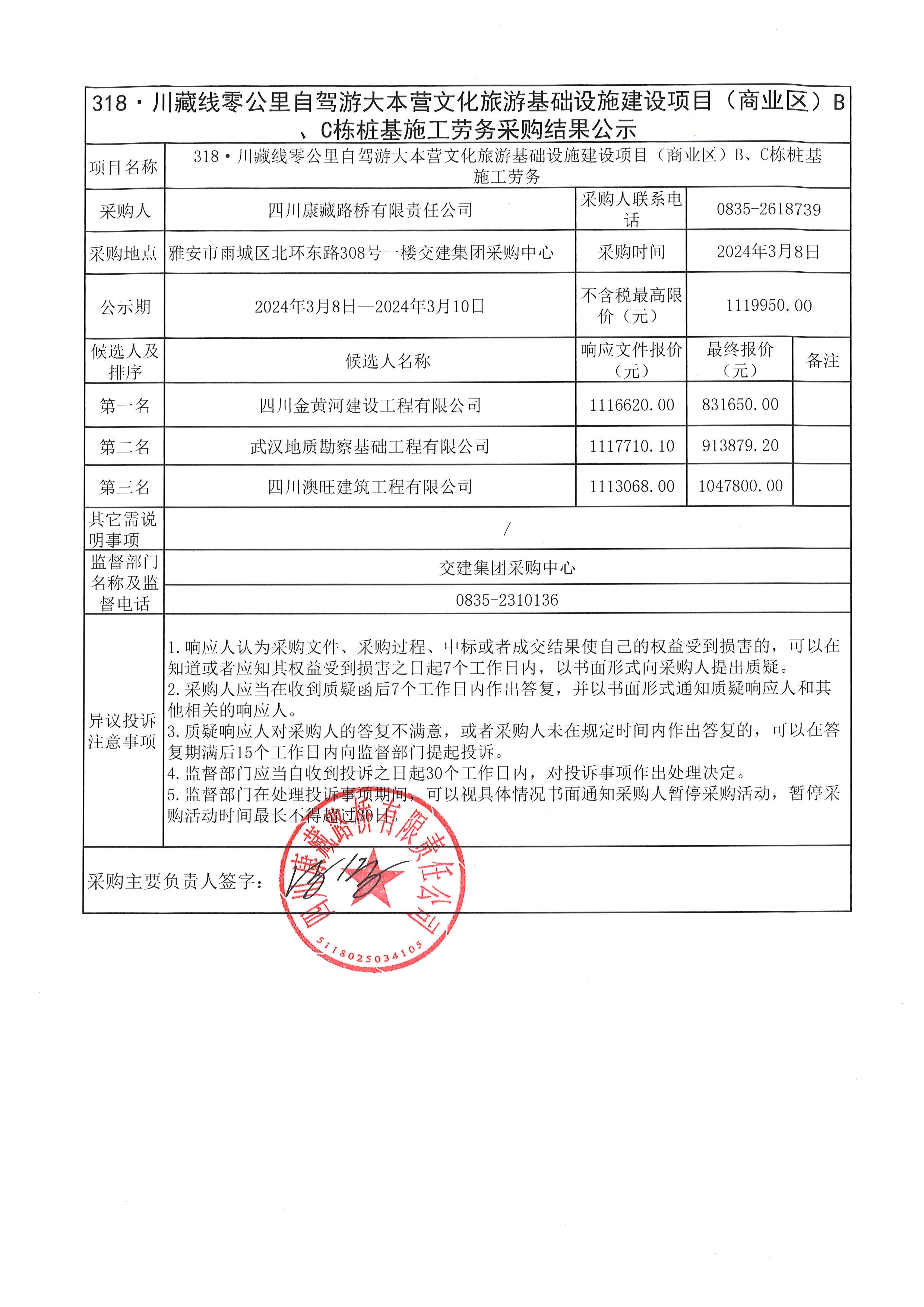 四川康藏路橋有限責(zé)任公司318·川藏線零公里自駕游大本營(yíng)文化旅游基礎(chǔ)設(shè)施建設(shè)項(xiàng)目(商業(yè)區(qū))B、C棟樁基施工勞務(wù)結(jié)果公示