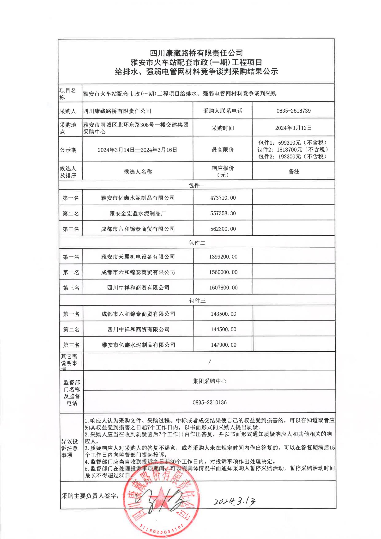 四川康藏路橋有限責(zé)任公司雅安市火車站配套市政(一期)工程項目給排水、強(qiáng)弱電管網(wǎng)材料采購結(jié)果公示
