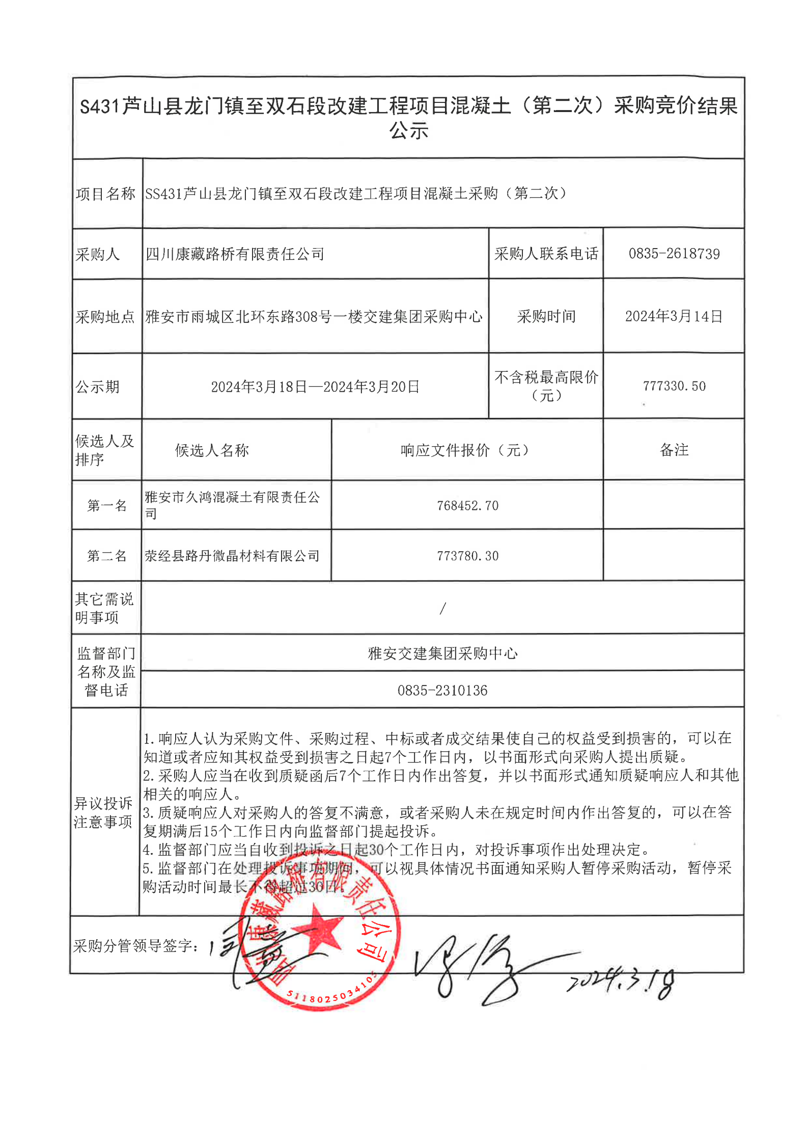 四川康藏路橋有限責(zé)任公司S431蘆山縣龍門鎮(zhèn)至雙石段改建工程項(xiàng)目混凝土(第二次)采購(gòu)競(jìng)價(jià)結(jié)果公示