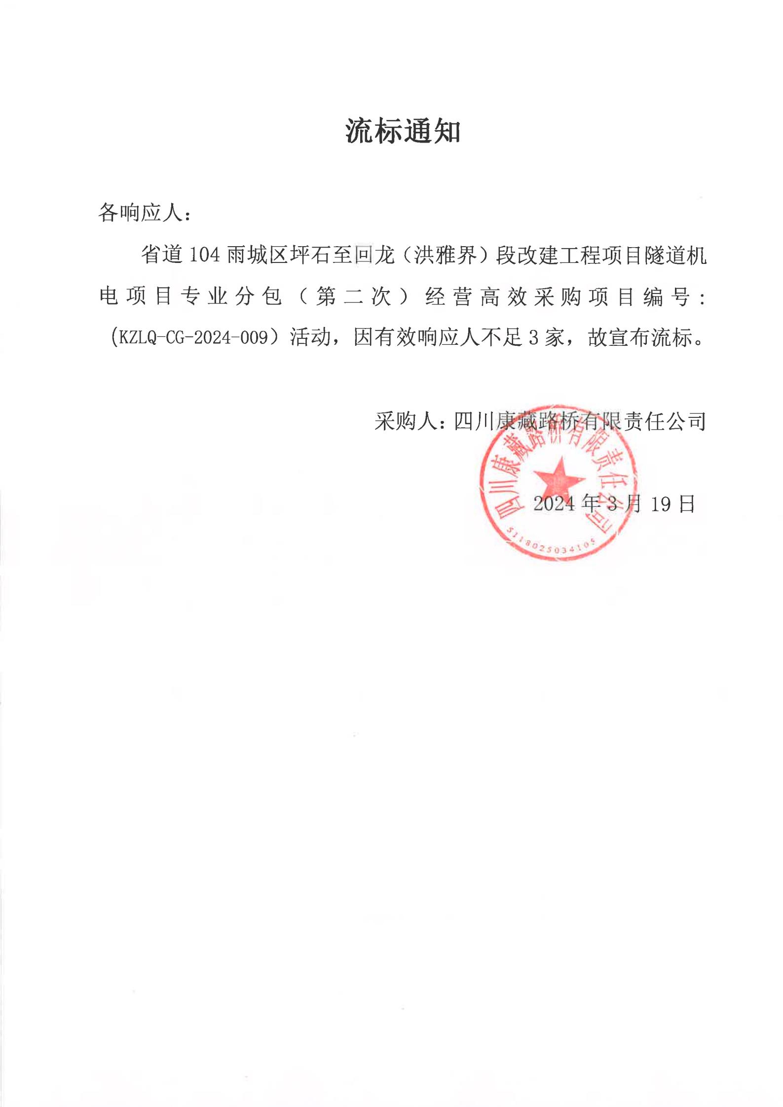四川康藏路橋有限責(zé)任公司省道104雨城區(qū)坪石至回龍(洪雅界)段改建工程項目隧道機(jī)電項目專業(yè)分包經(jīng)營高效采購(第二次)流標(biāo)通知