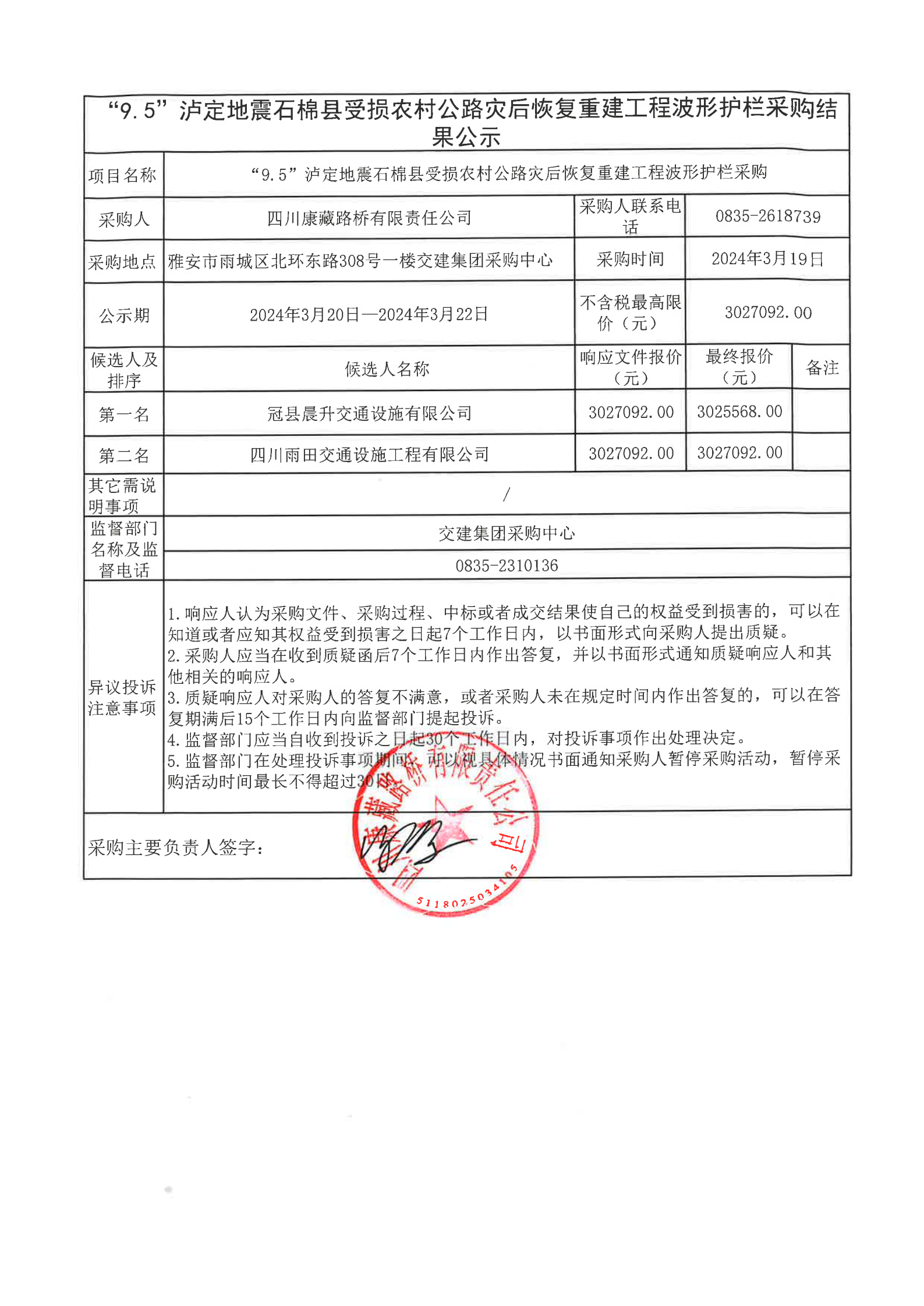 四川康藏路橋有限責任公司“9.5”瀘定地震石棉縣受損農(nóng)村公路災(zāi)后恢復(fù)重建工程波形護欄采購結(jié)果公示