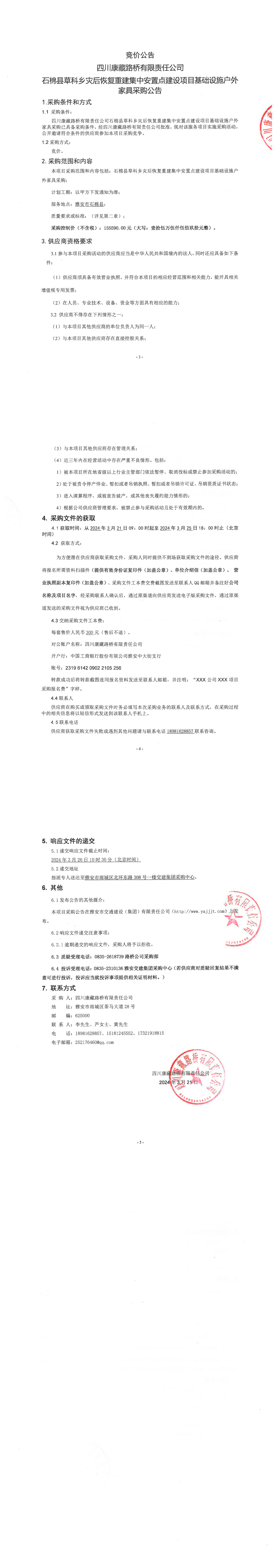 四川康藏路橋有限責(zé)任公司石棉縣草科鄉(xiāng)災(zāi)后恢復(fù)重建集中安置點(diǎn)建設(shè)項(xiàng)目基礎(chǔ)設(shè)施戶外家具采購公告