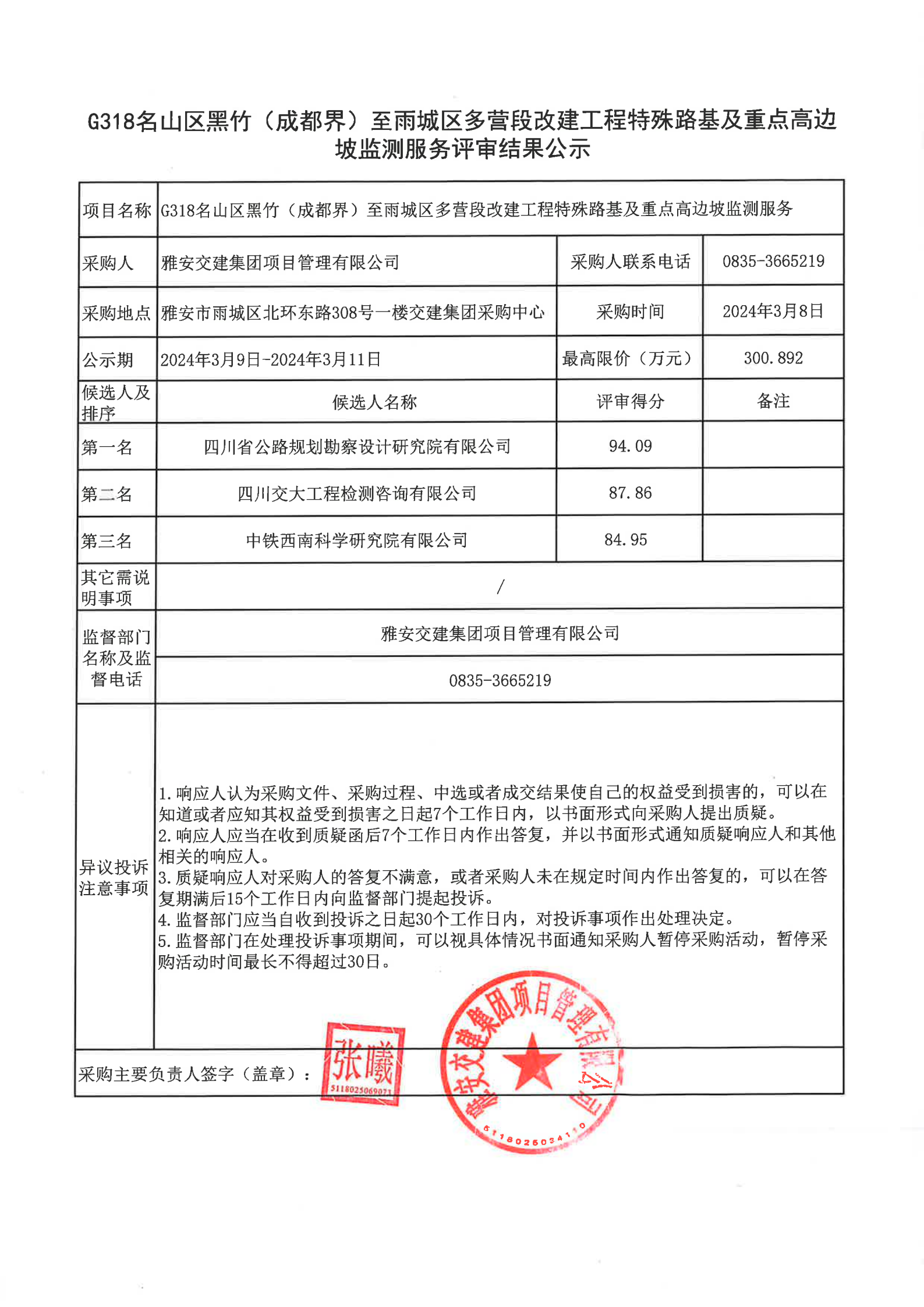 雅安交建集團(tuán)項目管理有限公司G318名山區(qū)黑竹(成度界)至雨城區(qū)多營段改建工程特殊路基及重點(diǎn)高邊坡監(jiān)測服務(wù)評審結(jié)果公示
