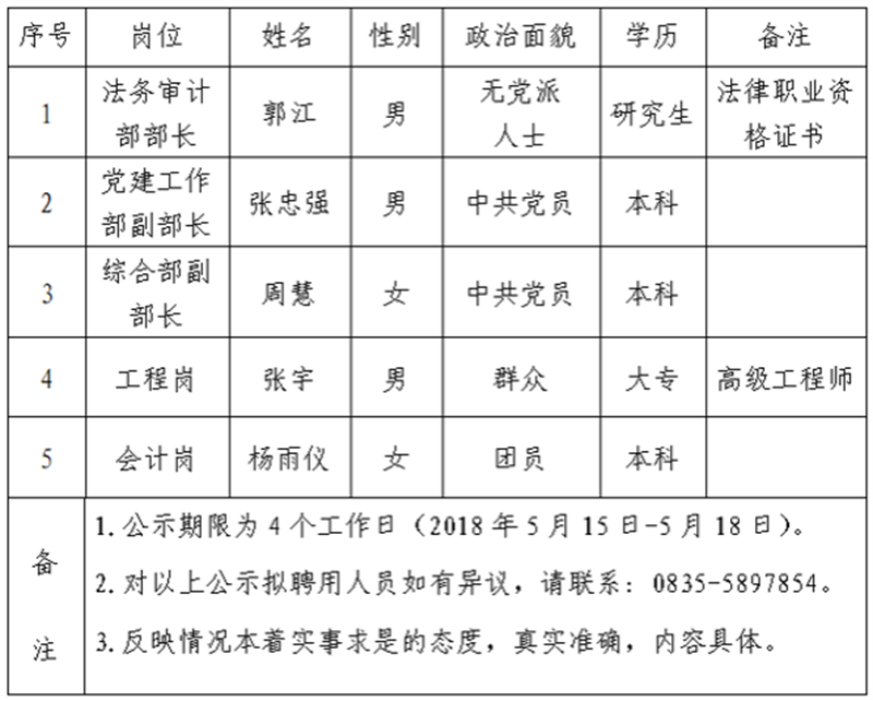 經(jīng)雅安市交通建設集團有限責任公司研究,對以下5名擬聘用人員予以公示: