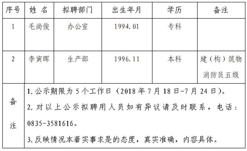 通過(guò)公開報(bào)名、資格審查、面試等程序,經(jīng)公司研究確定以下