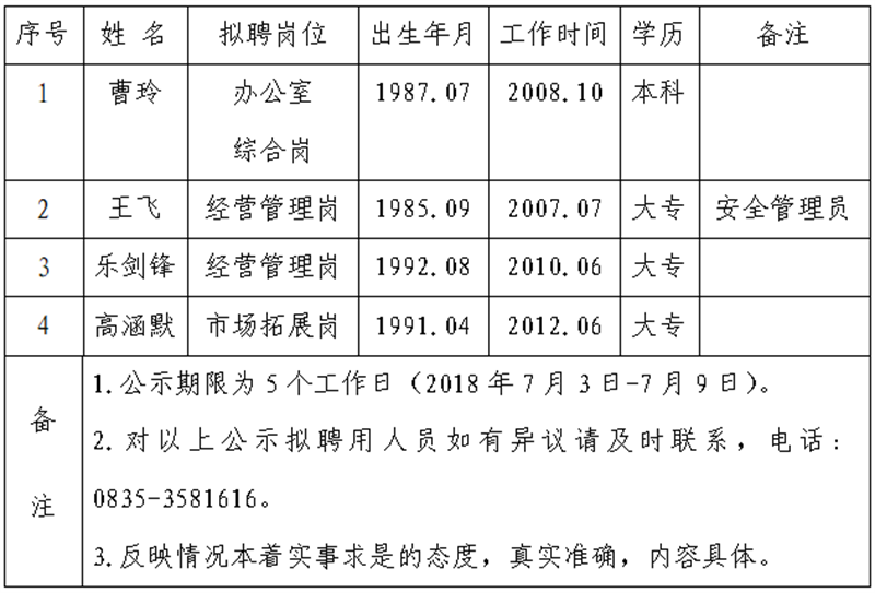 通過(guò)公開(kāi)報(bào)名、資格審查、面試等程序,經(jīng)公司研究確定以下4名擬聘用人員,現(xiàn)公示名單如下: