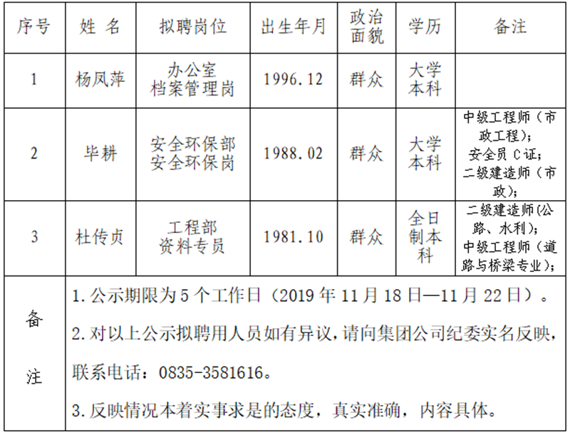 通過(guò)公開(kāi)報(bào)名、資格審查、面試等程序,經(jīng)雅安交建集團(tuán)資產(chǎn)經(jīng)營(yíng)管理有限公司研究擇優(yōu)確定以下3名擬聘用人員,現(xiàn)公示名單如下: