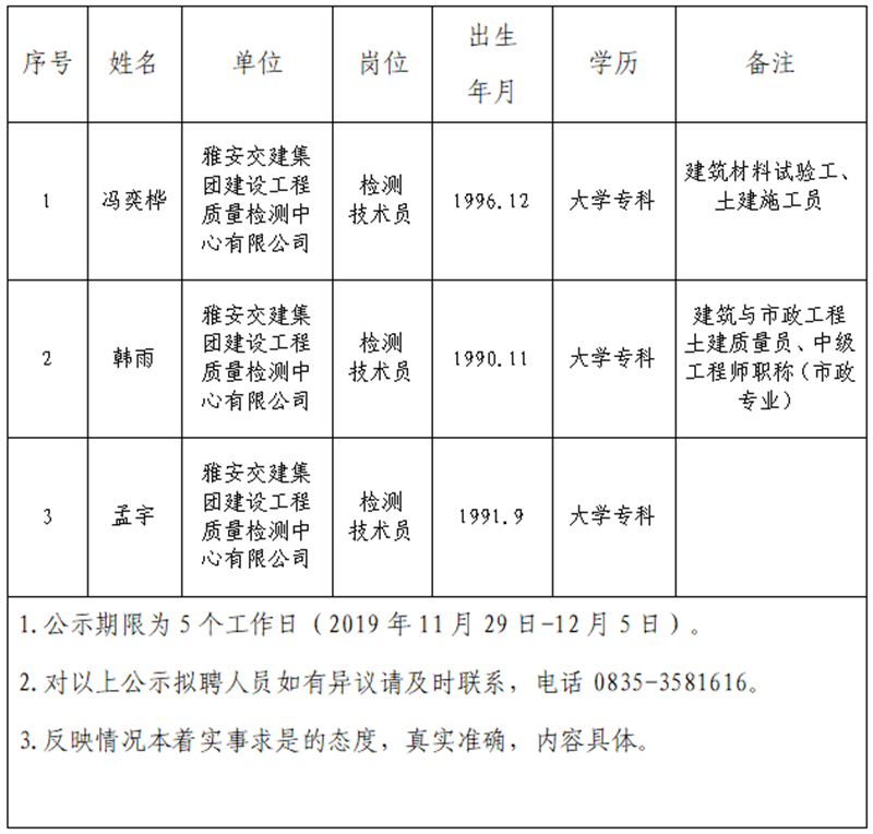 雅安交建集團子公司擬聘用人員公示(大興公司)