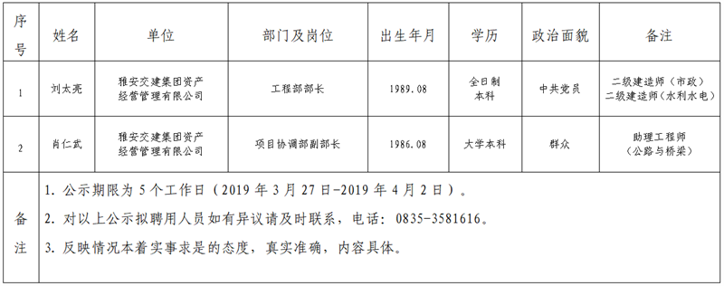 雅安交建集團子公司擬聘用人員公示(資產經(jīng)營管理公司)