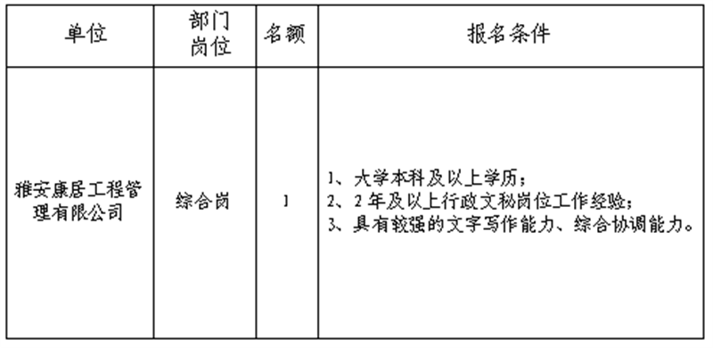 根據(jù)發(fā)展需要,決定面向社會公開招聘雅安市交通建設(shè)(集團(tuán))有限責(zé)任公司(以下簡稱“雅安交建集團(tuán)”)所屬子公司工作人員1名,現(xiàn)將有關(guān)事項(xiàng)公告如下: