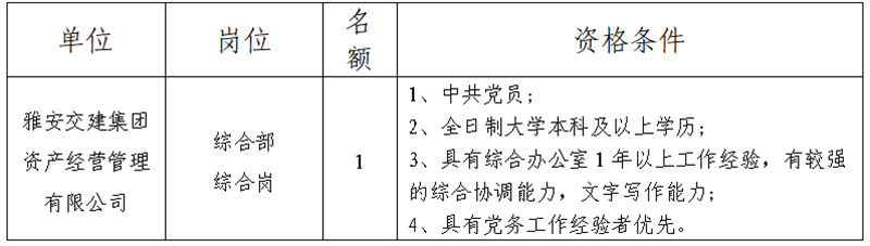 根據(jù)發(fā)展需要,決定面向社會(huì)公開招聘雅安市交通建設(shè)(集團(tuán))有限責(zé)任公司(以下簡稱“雅安交建集團(tuán)”)所屬子一般工作人員1名,現(xiàn)將有關(guān)事項(xiàng)公告如下: