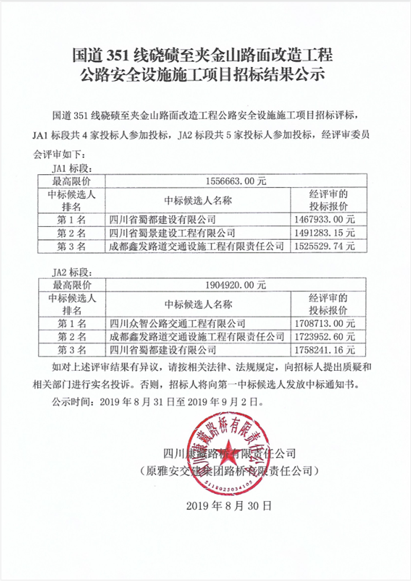 國(guó)道351線磽磧至夾金山路面改造工程公路安全設(shè)施施工項(xiàng)目招標(biāo)結(jié)果公示