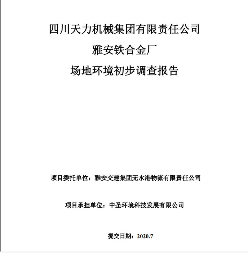 四川天力機(jī)械集團(tuán)有限責(zé)任公司——雅安鐵合金廠場地環(huán)境初步調(diào)查報告
