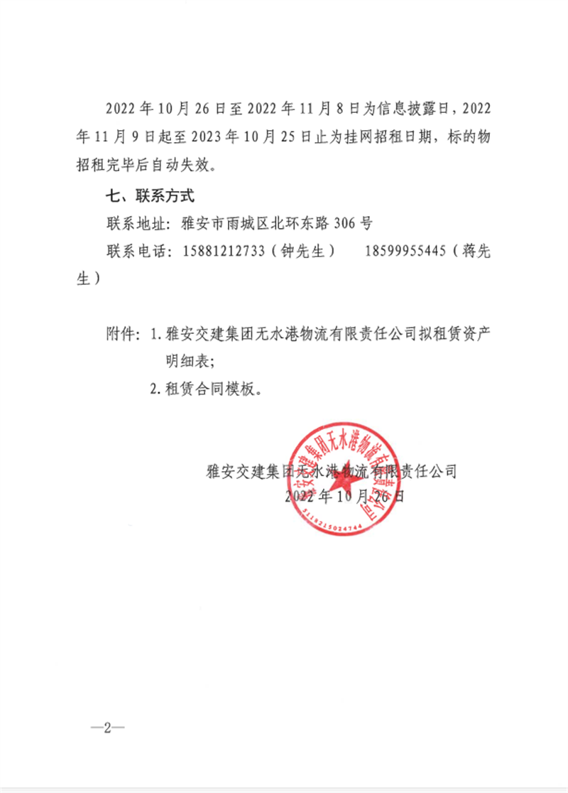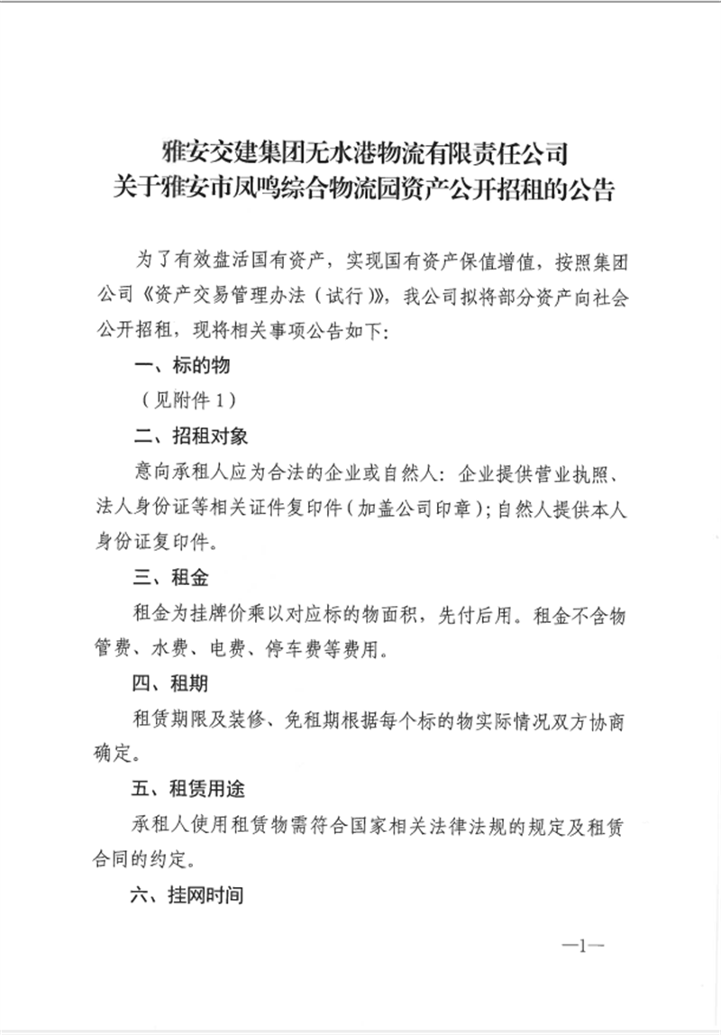 雅安交建集團(tuán)無(wú)水港物流有限責(zé)任公司關(guān)于雅安市鳳鳴綜合物流園資產(chǎn)公開招租的公告