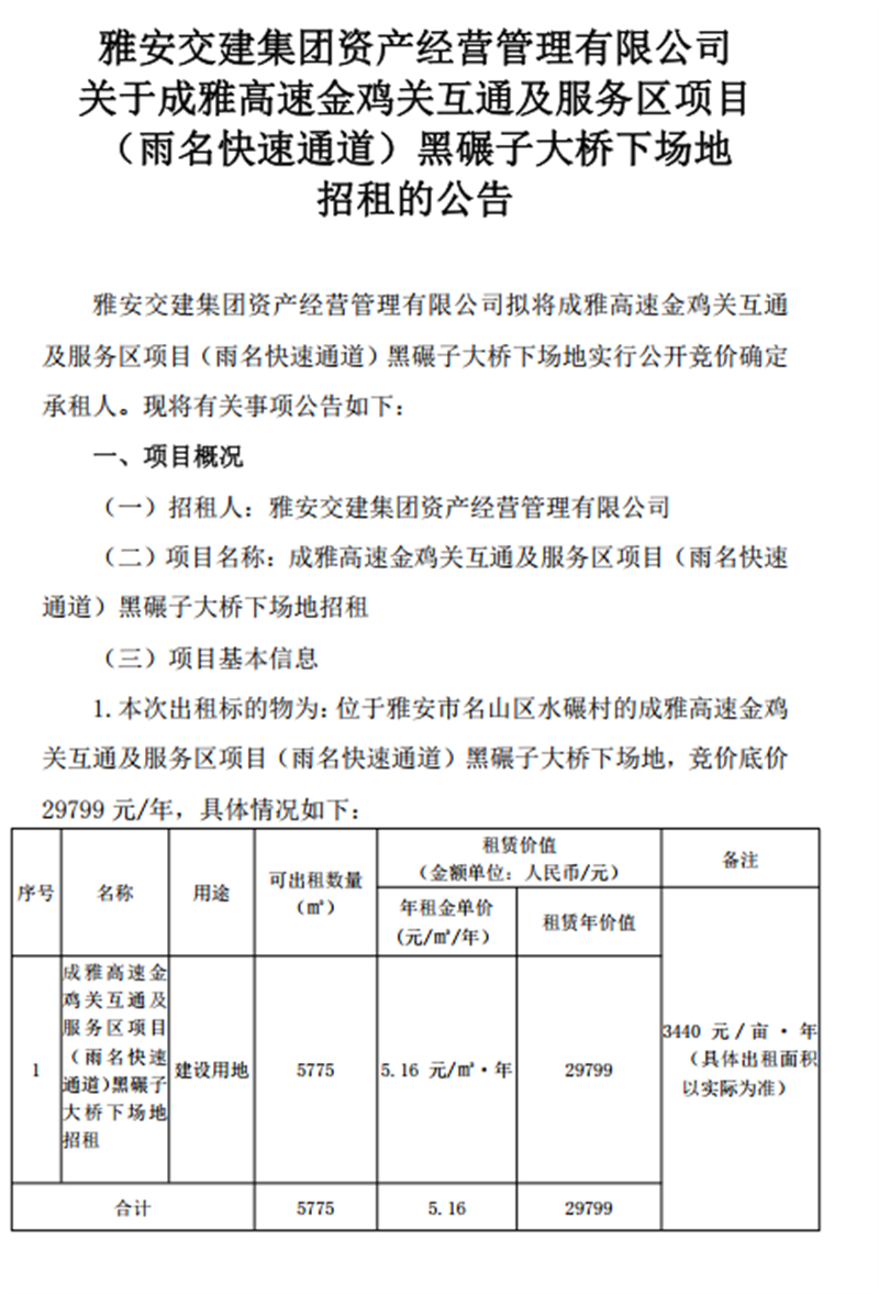 關于成雅高速金雞關互通及服務區(qū)項目(雨名快速通道)黑碾子大橋下場地招租的公告