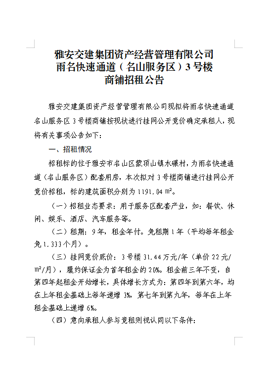 雅安交建集團(tuán)資產(chǎn)經(jīng)營管理有限公司 雨名快速通道(名山服務(wù)區(qū))3號(hào)樓商鋪招租公告