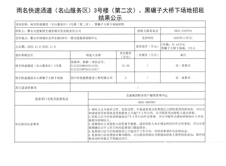 ÑŰ²½»½¨¼¯ˆF½»Í¨ÙYÔ´é_°l(f¨¡)ÓÐÏÞØŸ(z¨¦)Èι«Ë¾ÓêÃû¿ìËÙͨµÀ£¨Ãûɽ·þ„Õ(w¨´)…^(q¨±)£©3Ì–˜Ç£¨µÚ¶þ´Î£©ºÚÄë×Ó´ó˜òψöµØÕÐ×â½Y(ji¨¦)¹û¹«Ê¾