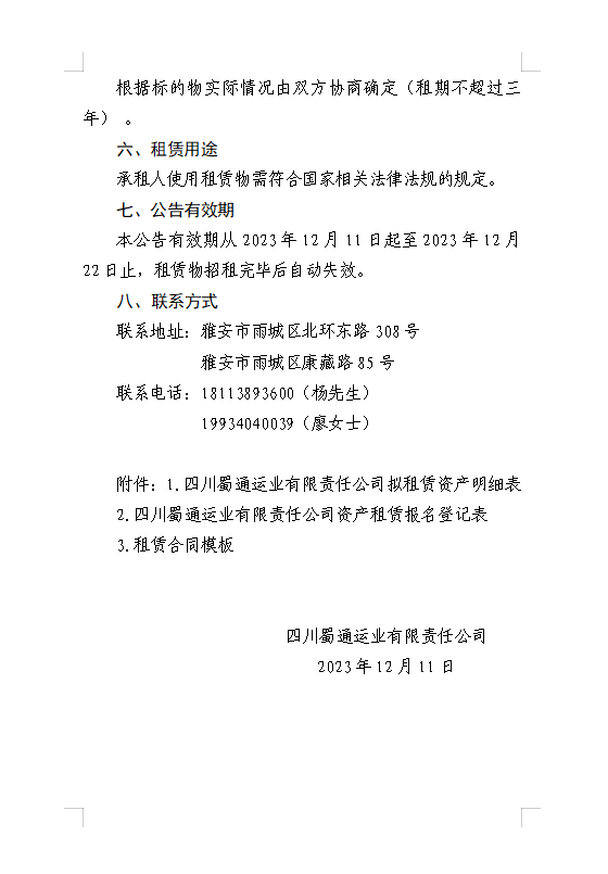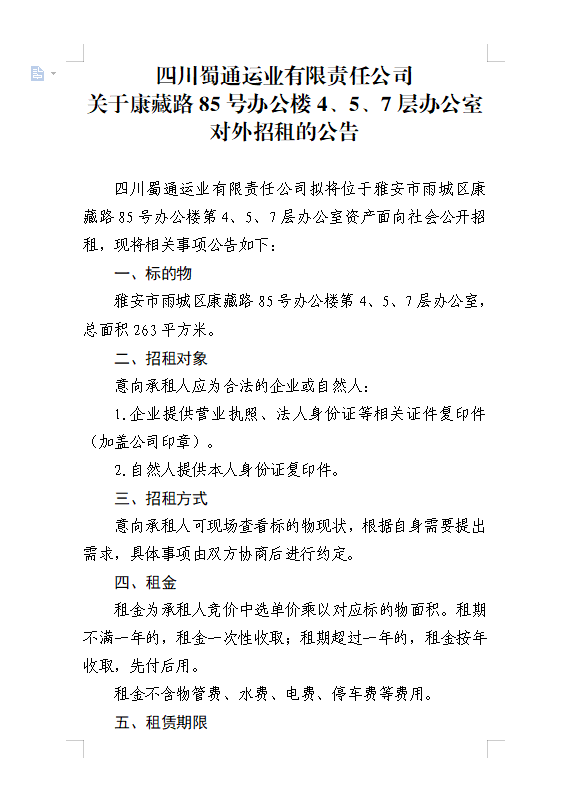 四川蜀通運(yùn)業(yè)有限責(zé)任公司關(guān)于康藏路85號辦公樓4、5、7樓資產(chǎn)租賃公告附件