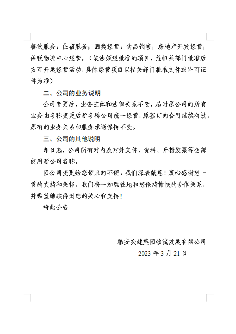 雅安交建集團物流發(fā)展有限公司關于雅安交建集團無水港物流有限責任公司工商變更的公告