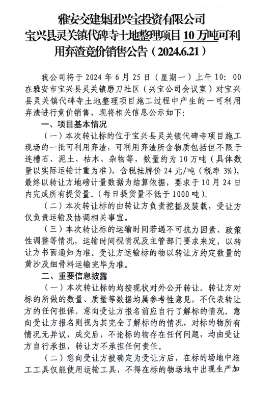 雅安交建集團興寶投資有限公司寶興縣靈關鎮(zhèn)代碑寺土地整理項目10萬噸可利用棄渣競價銷售公告(2024.6.21)