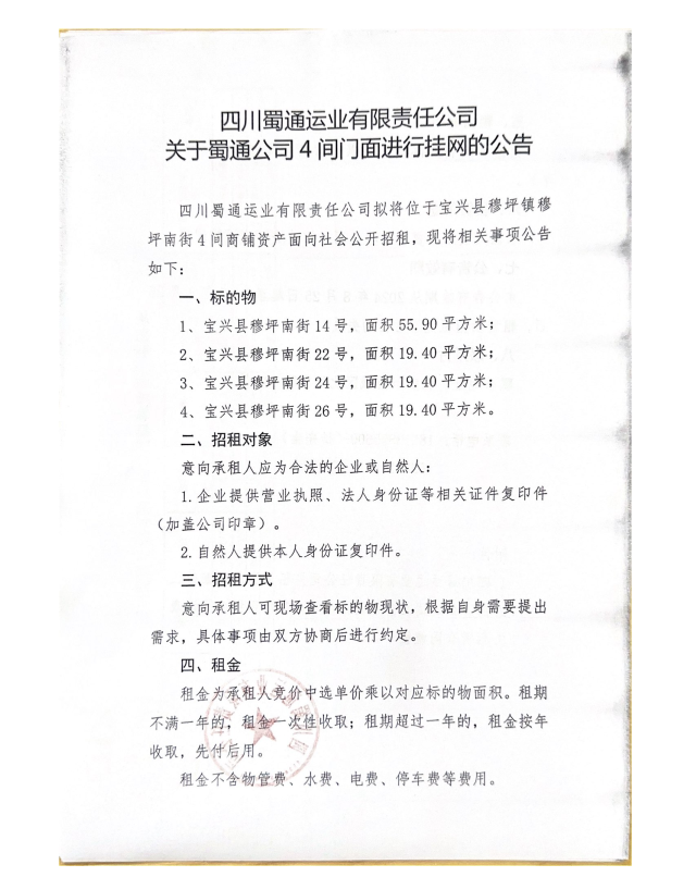 四川蜀通運(yùn)業(yè)有限責(zé)任公司關(guān)于蜀通公司4間門(mén)面進(jìn)行掛網(wǎng)的公告附件