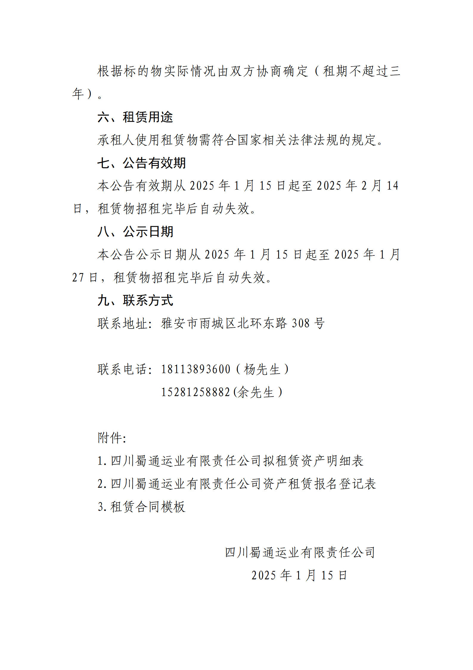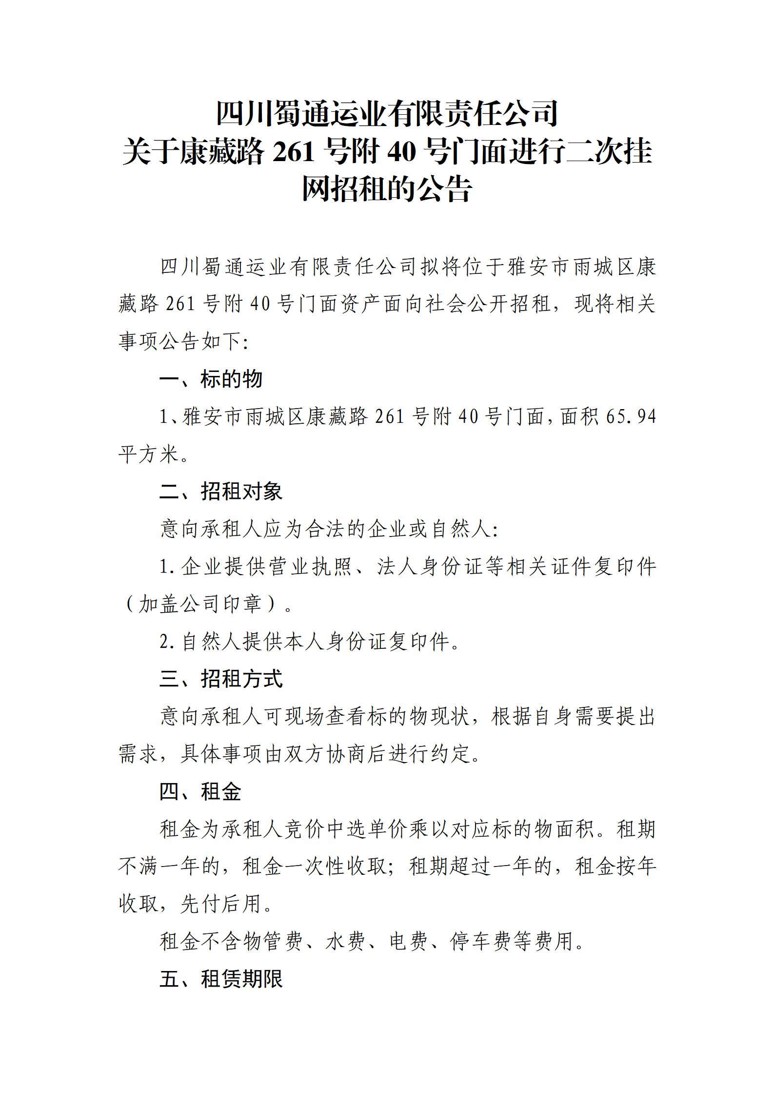 四川蜀通運(yùn)業(yè)有限責(zé)任公司 關(guān)于康藏路261號(hào)附40號(hào)門(mén)面進(jìn)行二次掛網(wǎng)招租的公告