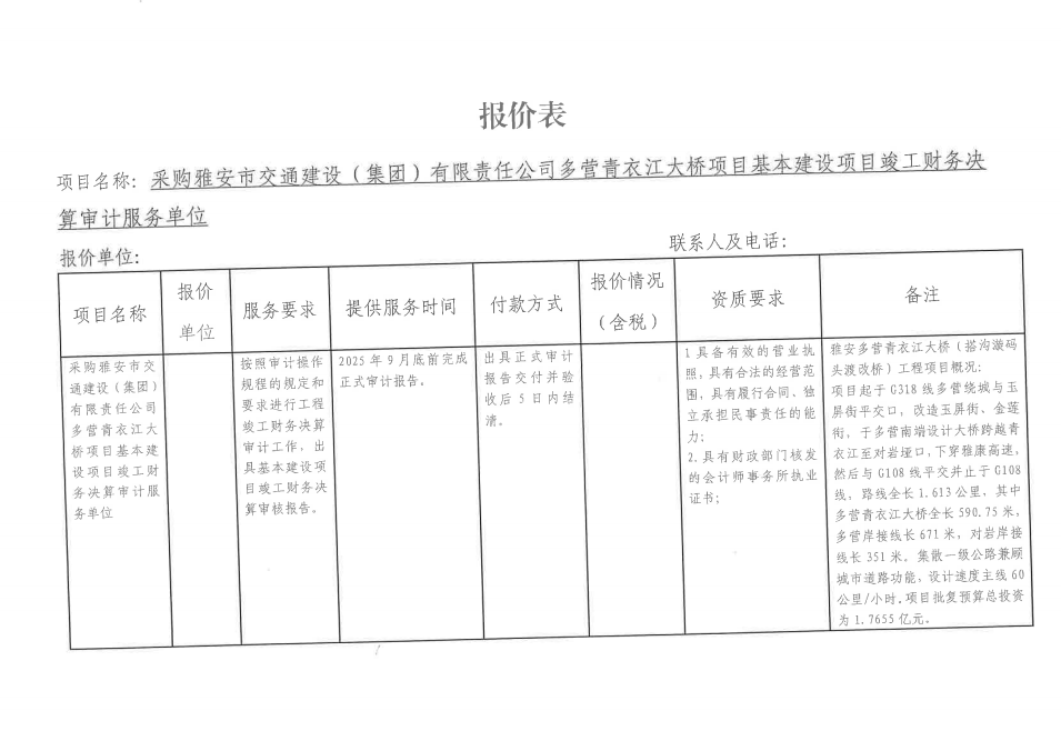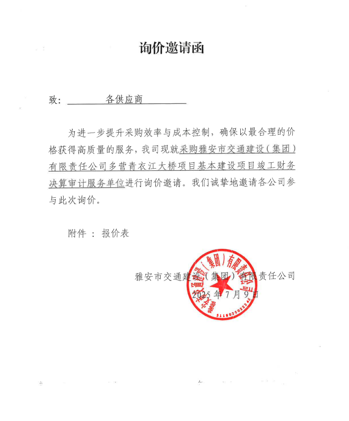 詢價邀請函——采購雅安市交通建設(shè)(集團)有限責(zé)任公司多營青衣江大橋項目基本建設(shè)項目竣工財務(wù)決算審計服務(wù)單位