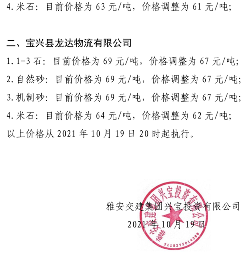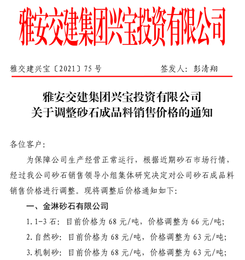 雅安交建集團興寶公司關(guān)于調(diào)整成品料銷售價格的通知(2021.10.20)