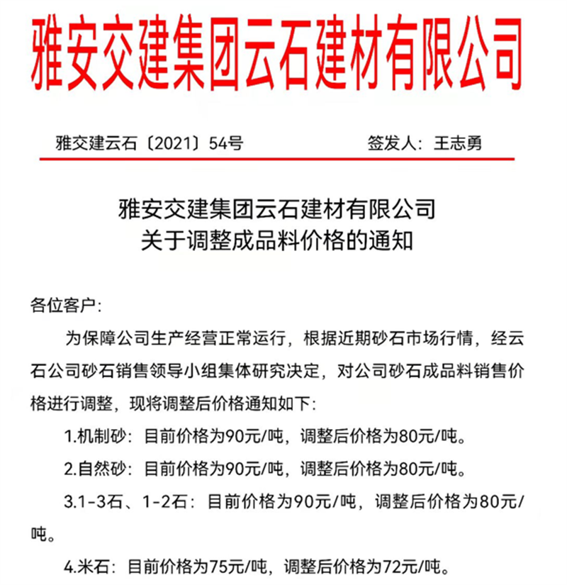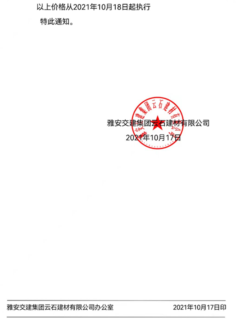 雅安交建集團(tuán)云石公司關(guān)于調(diào)整成品料銷售價格的通知(2021.10.17)