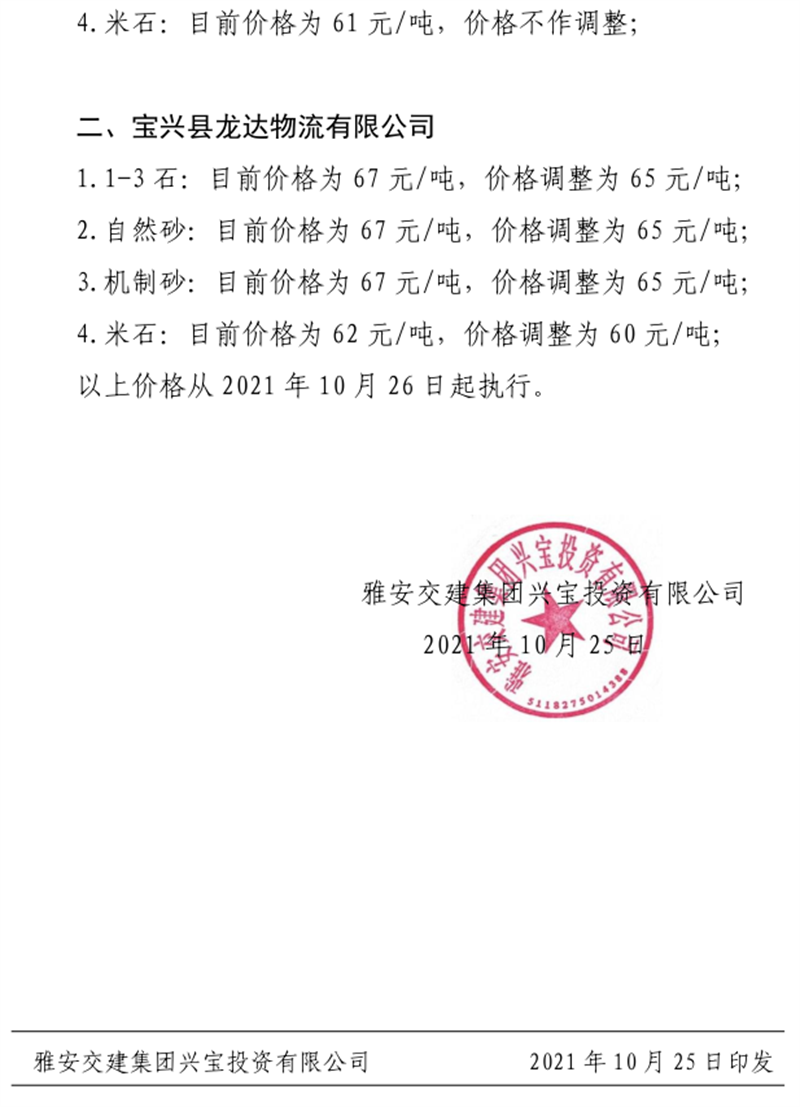 雅安交建集團興寶公司關于調整成品料銷售價格的通知(2021.10.26)