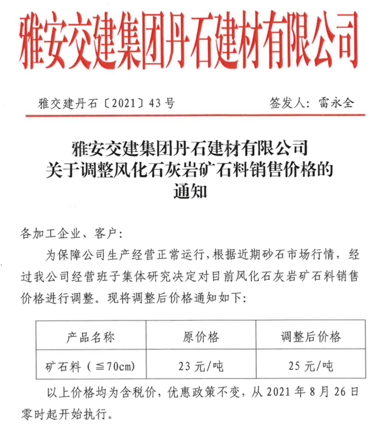 雅安交建集團丹石公司關(guān)于調(diào)整風(fēng)化石灰?guī)r礦石料銷售價格的通知