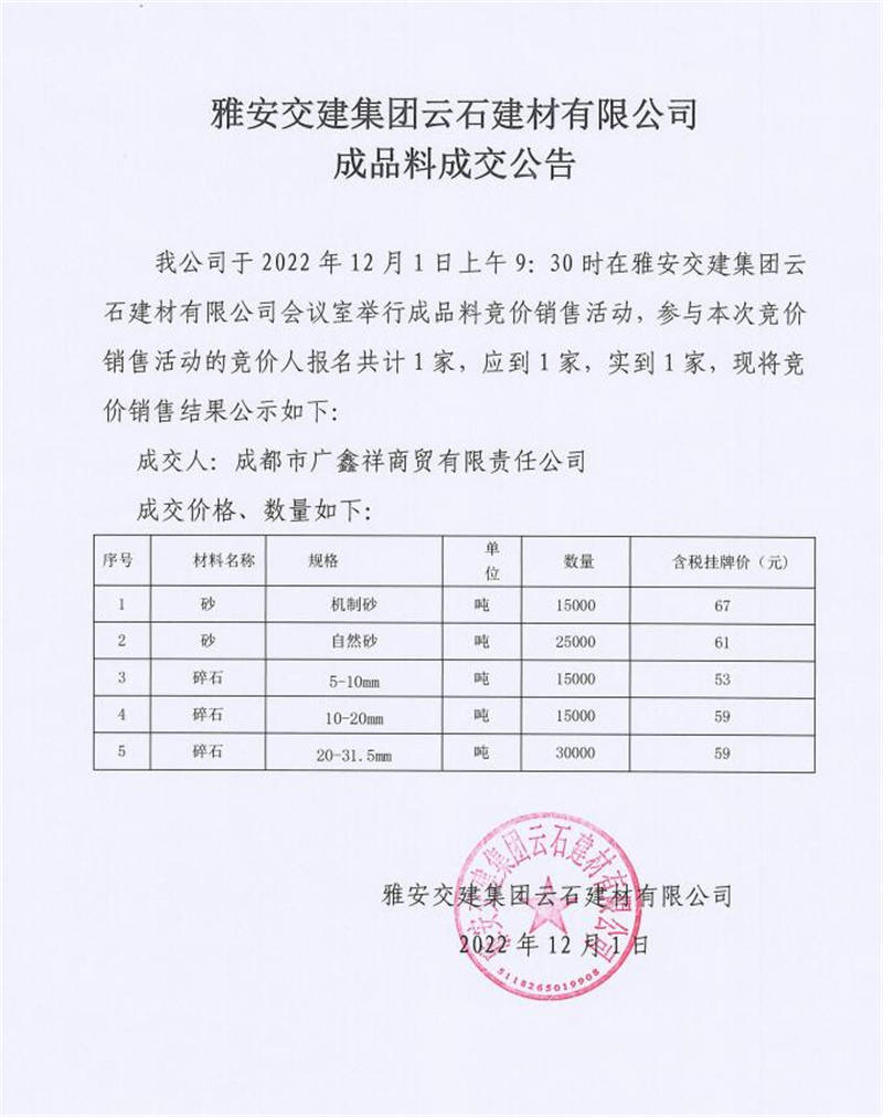 雅安交建集團(tuán)云石建材有限公司成品料競(jìng)價(jià)銷售成交公告(2022-12-01)