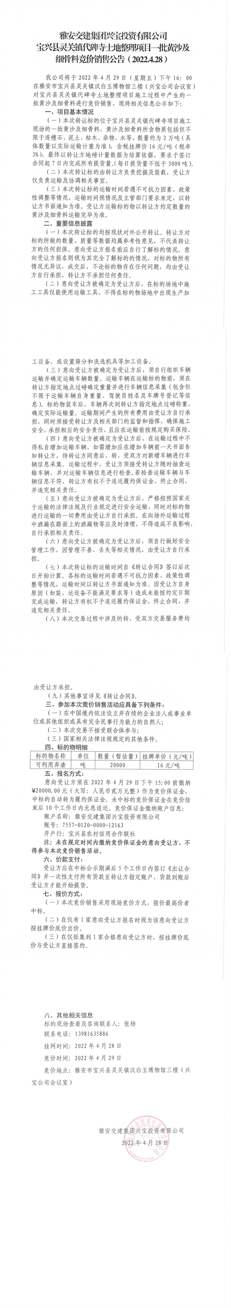 雅安交建集團(tuán)興寶投資有限公司寶興縣靈關(guān)鎮(zhèn)代碑寺土地整理項目一批黃沙及細(xì)骨料競價銷售公告(2022.4.28)