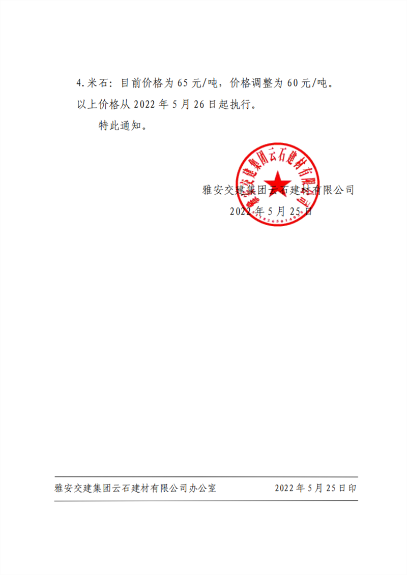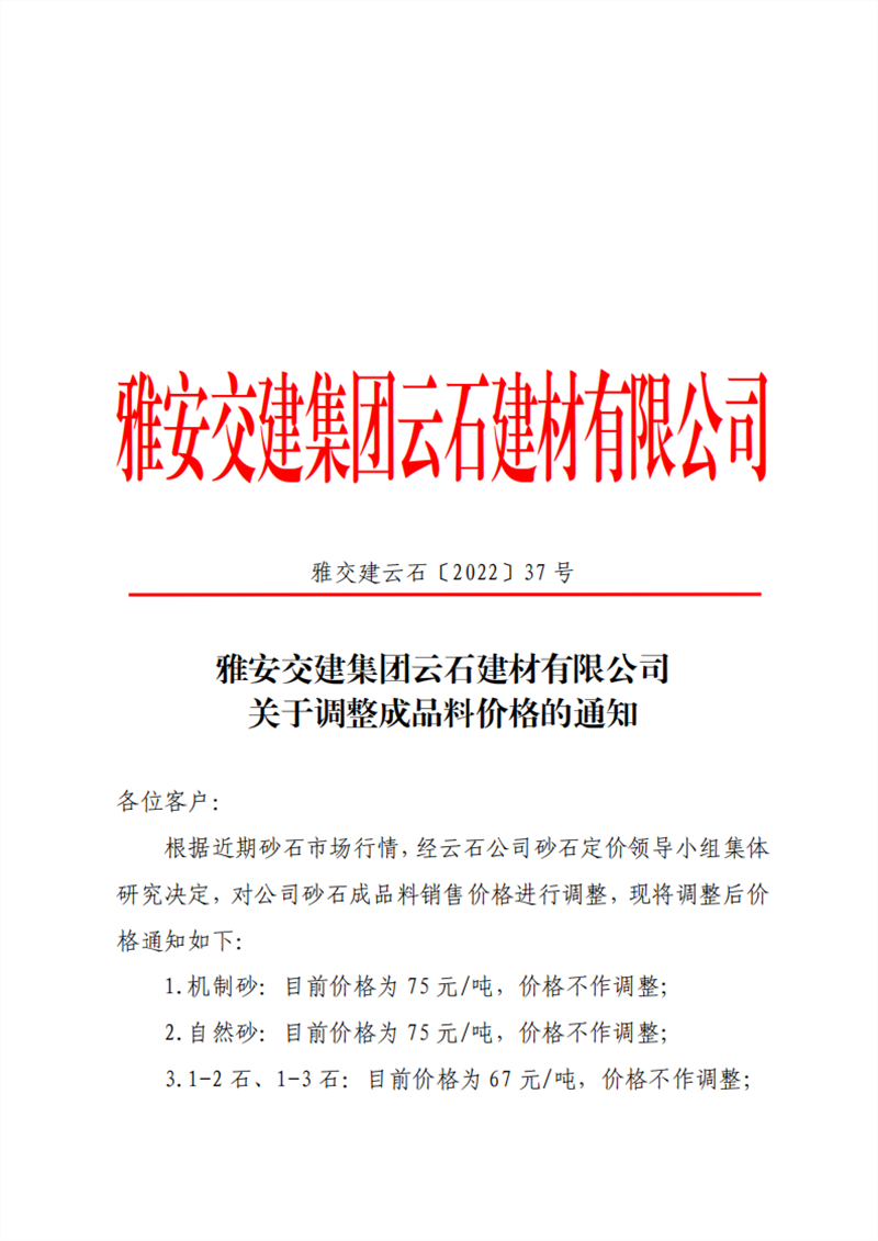 雅安交建集團(tuán)云石建材有限公司 關(guān)于調(diào)整成品料價格的通知--2022-5-25