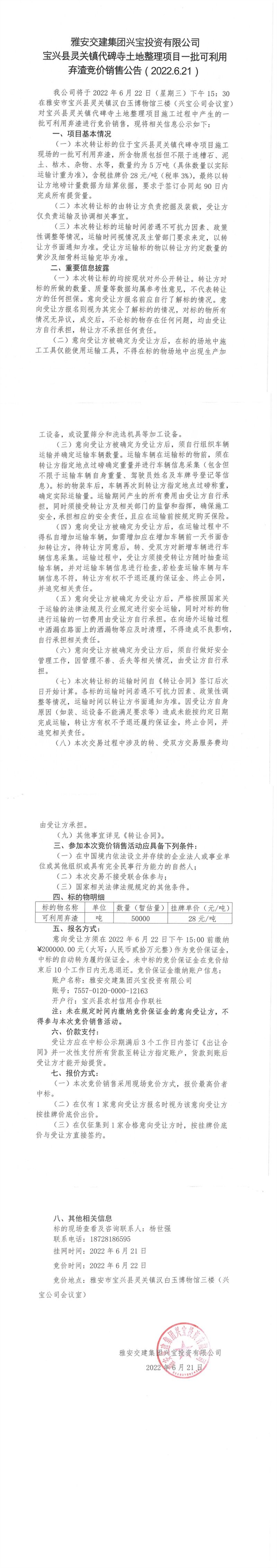 雅安交建集團興寶投資有限公司寶興縣靈關(guān)鎮(zhèn)代碑寺土地整理項目-批可利用 棄渣競價銷售公告( 2022.6.21)