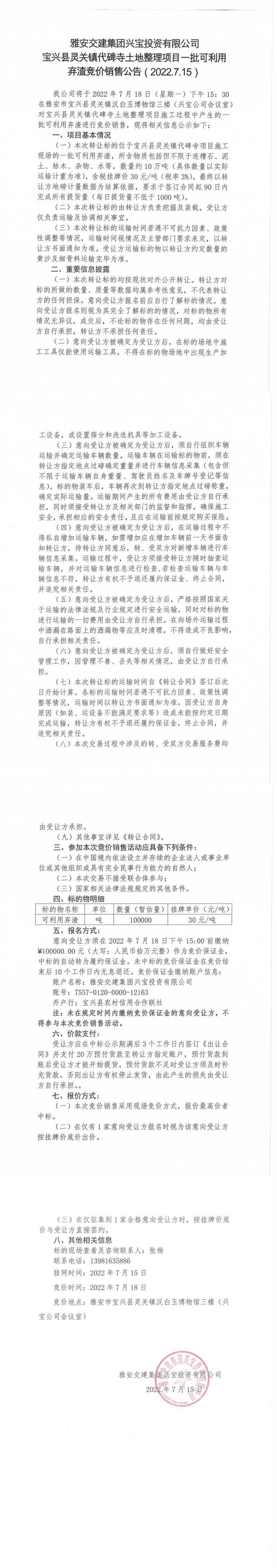 寶興縣靈關鎮(zhèn)代碑寺土地整理項目一批可利用棄渣競價銷售公告7.15(10萬噸)