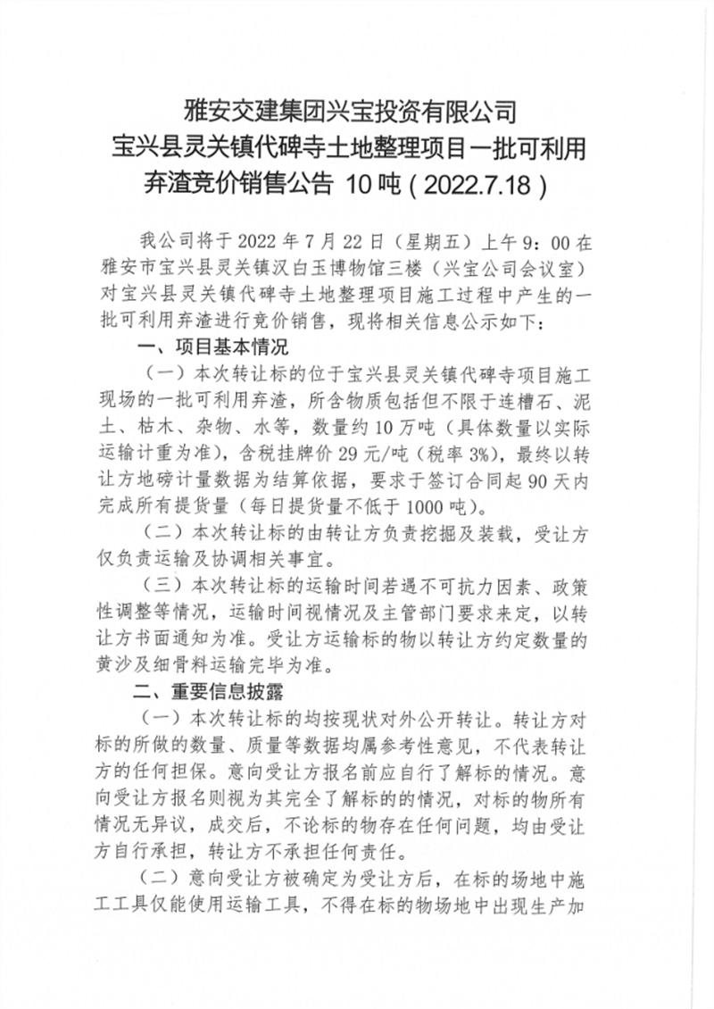寶興縣靈關(guān)鎮(zhèn)代碑寺土地整理項(xiàng)目一批可利用棄渣競(jìng)價(jià)銷售公告7.18(10萬(wàn)噸)