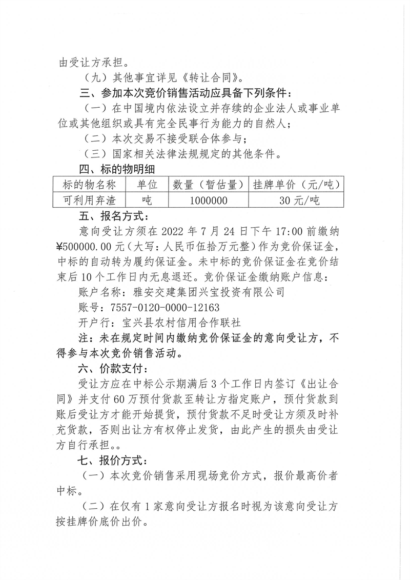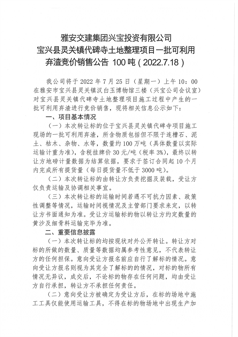 興寶公司寶興縣靈關(guān)鎮(zhèn)代碑寺土地整理項(xiàng)目10萬噸可利用棄渣競(jìng)價(jià)銷售掛網(wǎng)公告掛網(wǎng)公告7.22(5萬噸)