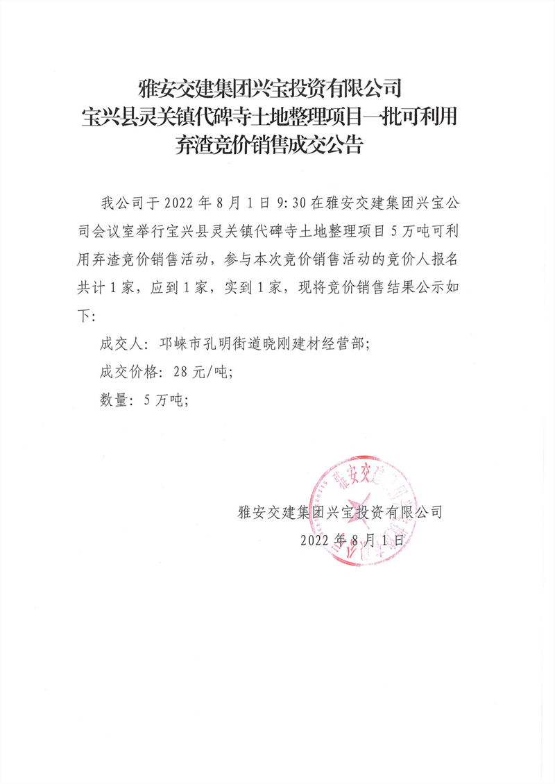 雅安交建集團興寶投資有限公司靈關鎮(zhèn)代碑寺土地整理項目10萬噸可利用棄渣競價銷售成交公告(2022.8.1)
