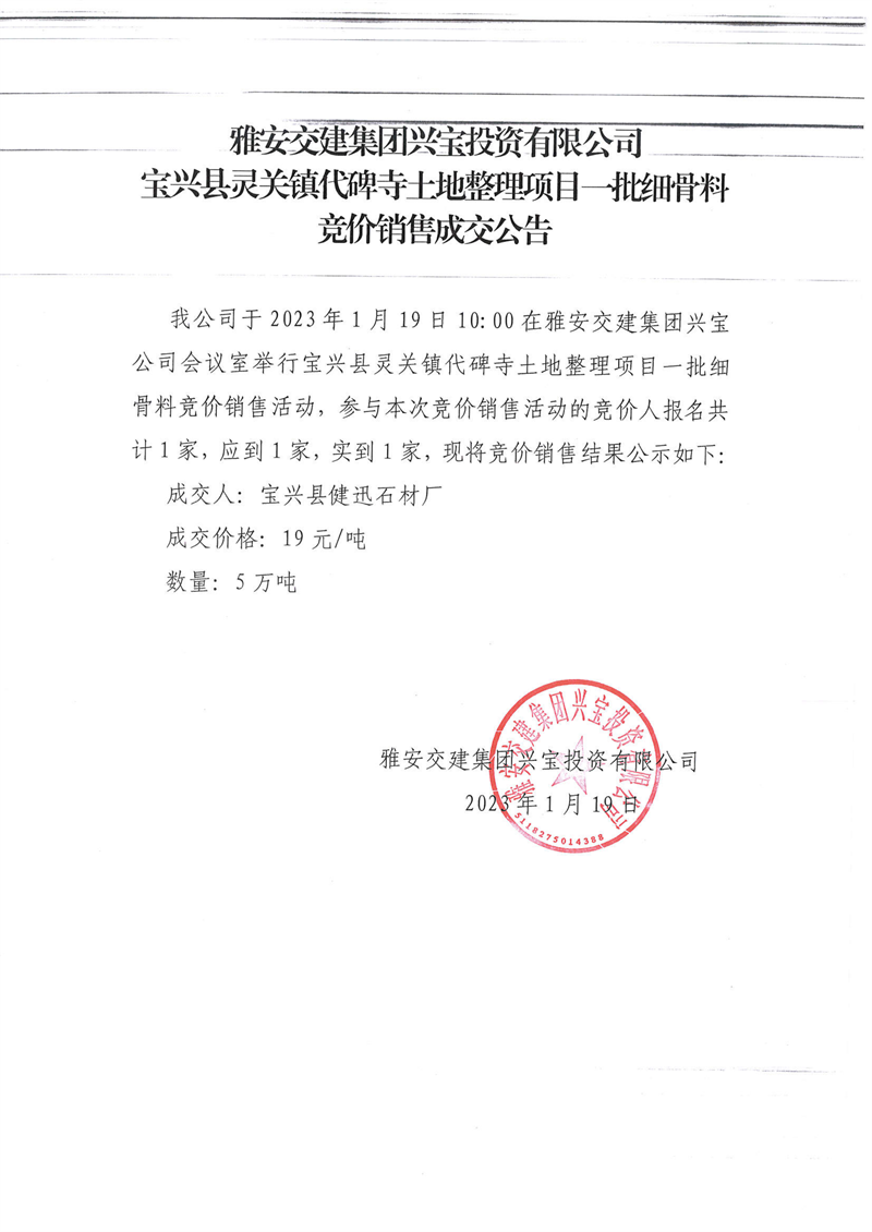 雅安交建集團(tuán)興寶投資有限公司代碑寺土地整理項(xiàng)目細(xì)骨料競價(jià)銷售成交公告(2023.1.19)
