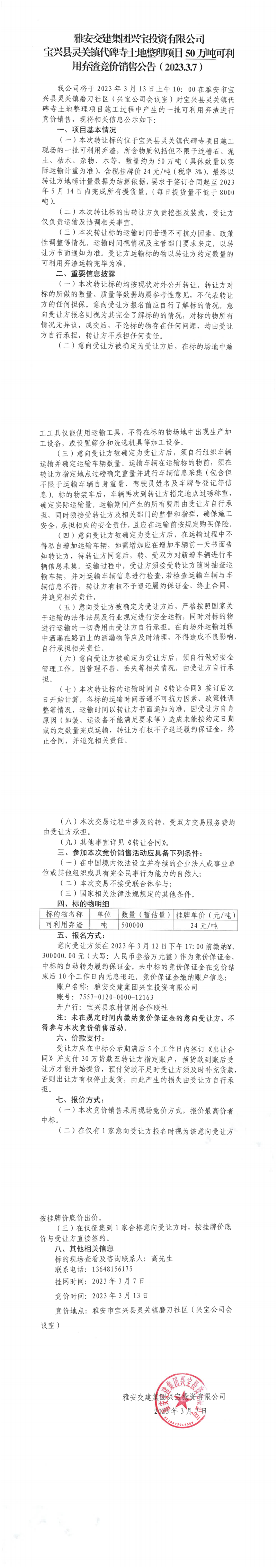 雅安交建集團(tuán)興寶投資有限公司靈關(guān)鎮(zhèn)代碑寺土地整理項目50萬噸可利用棄渣競價銷售公告(2023.3.7)