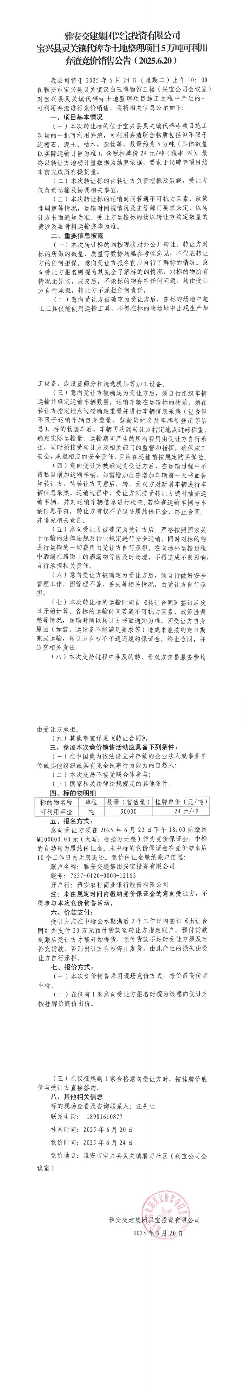 雅安交建集團(tuán)興寶投資有限公司寶興縣靈關(guān)鎮(zhèn)代碑寺土地整理項目10萬噸可利用棄渣競價銷售公告